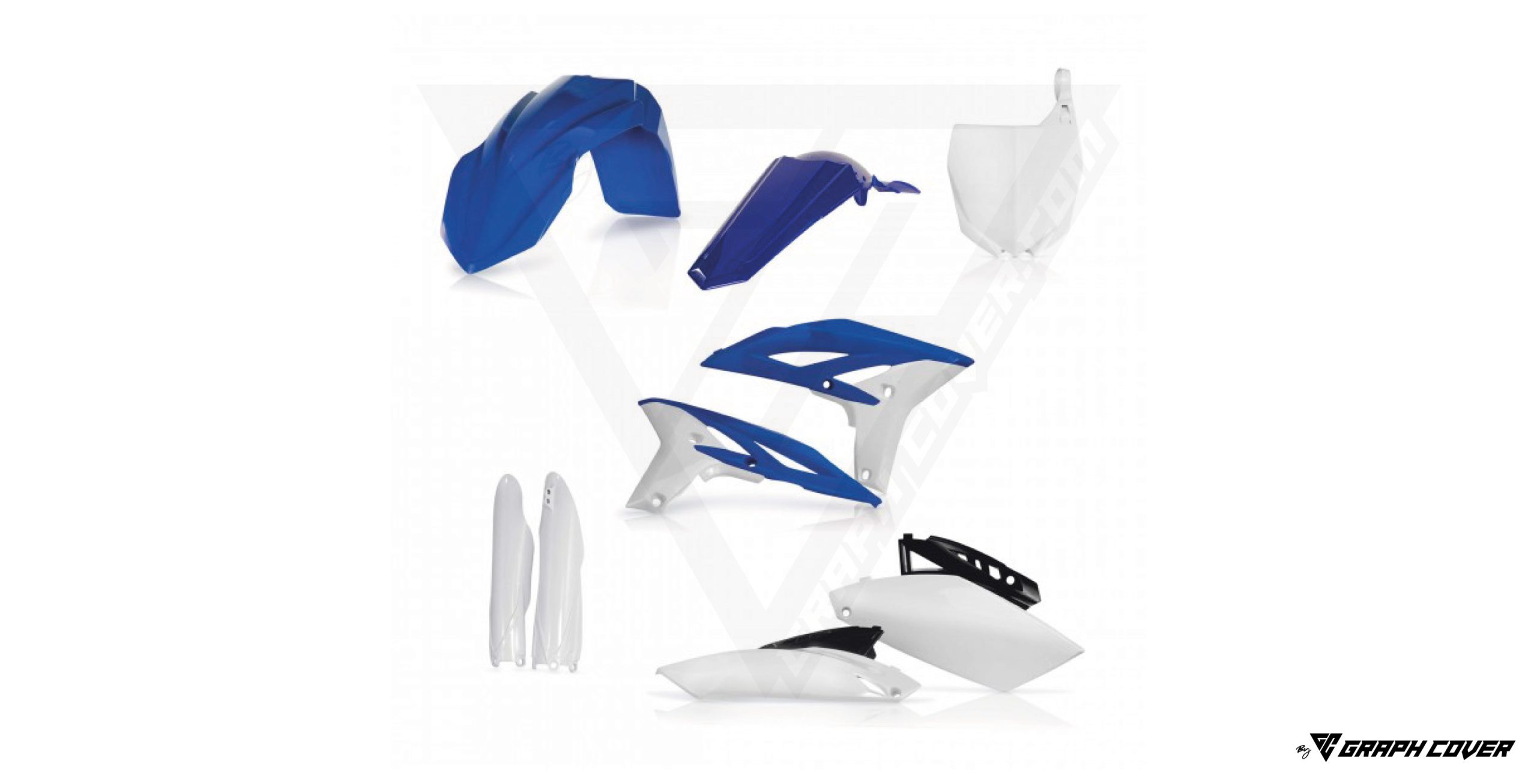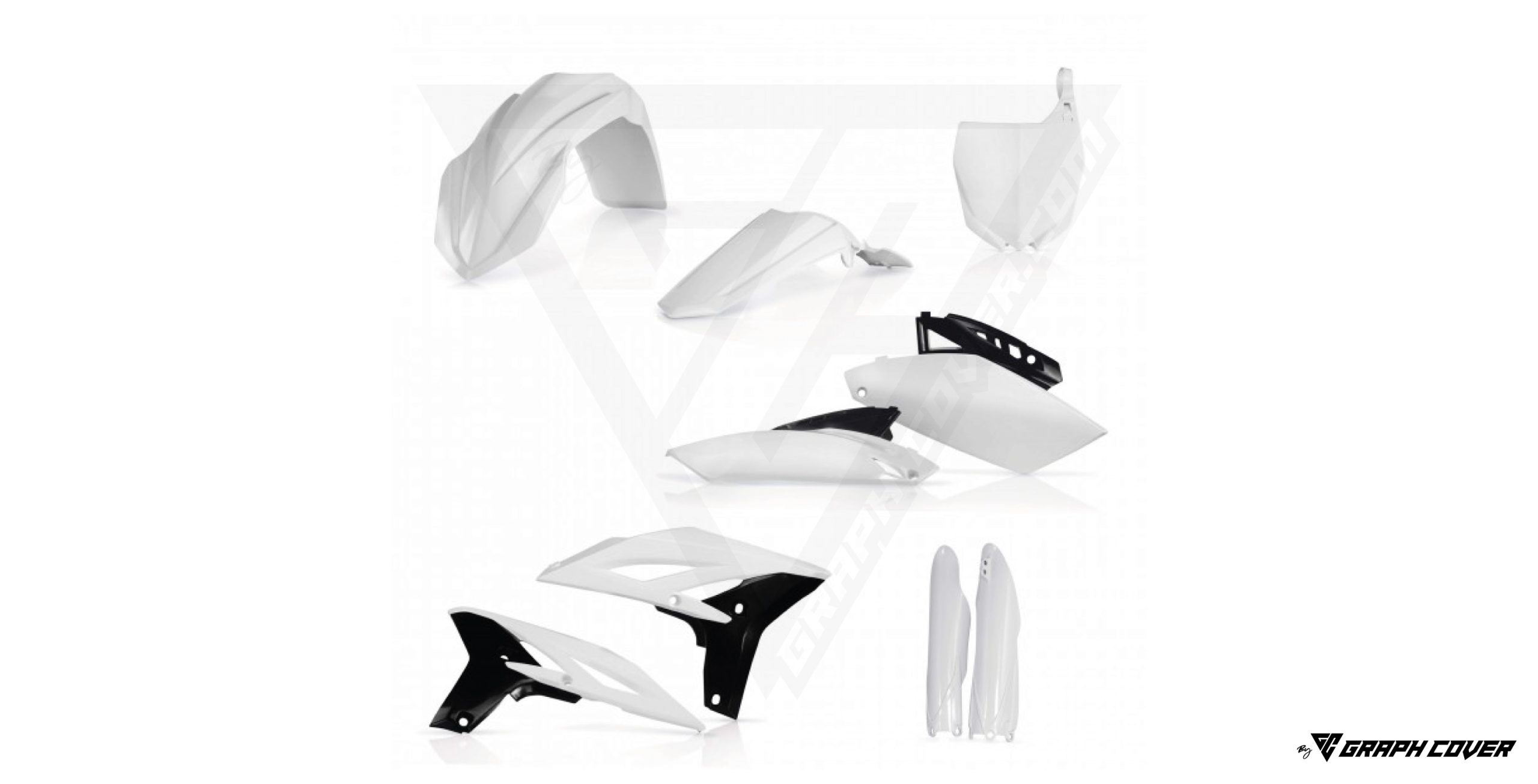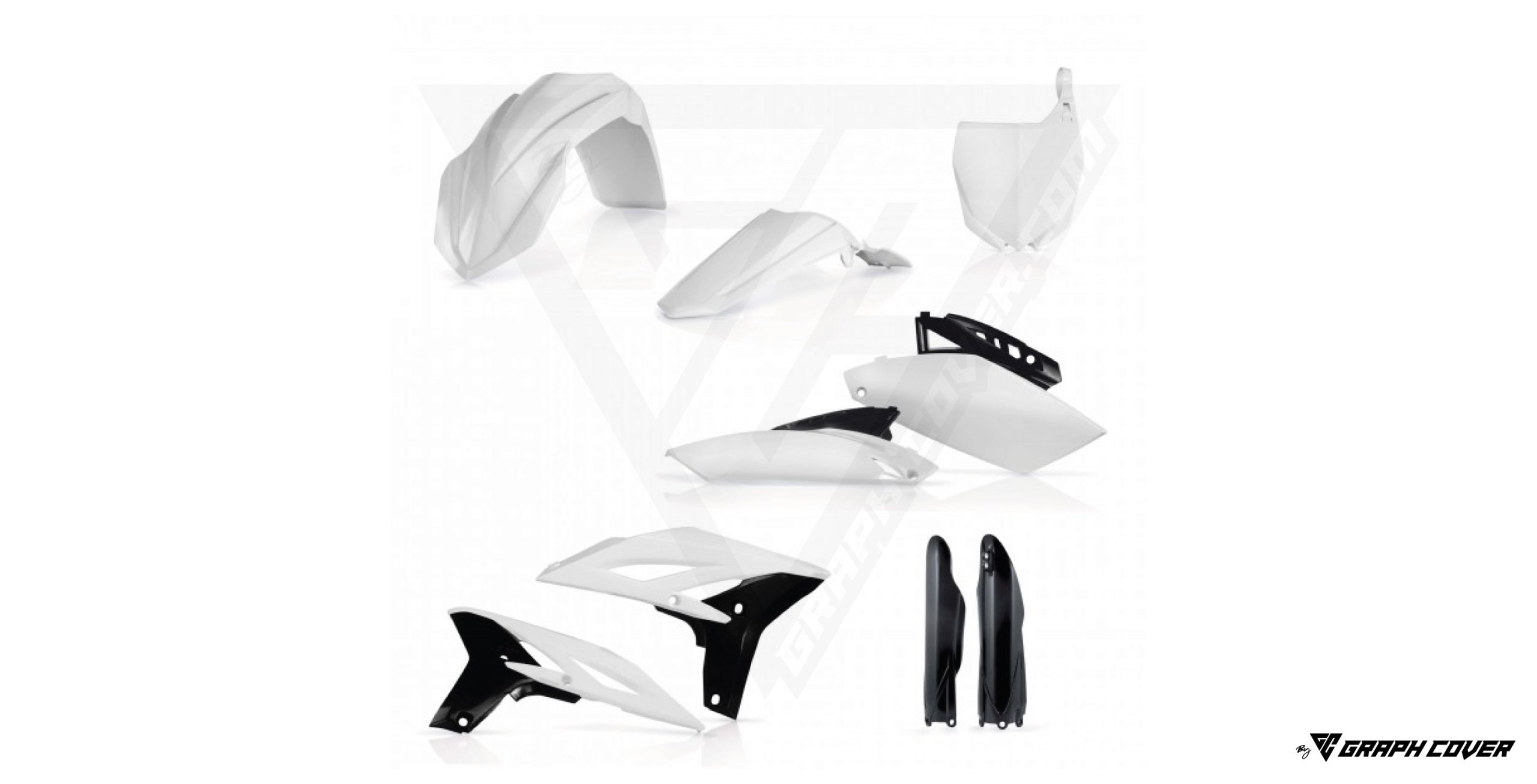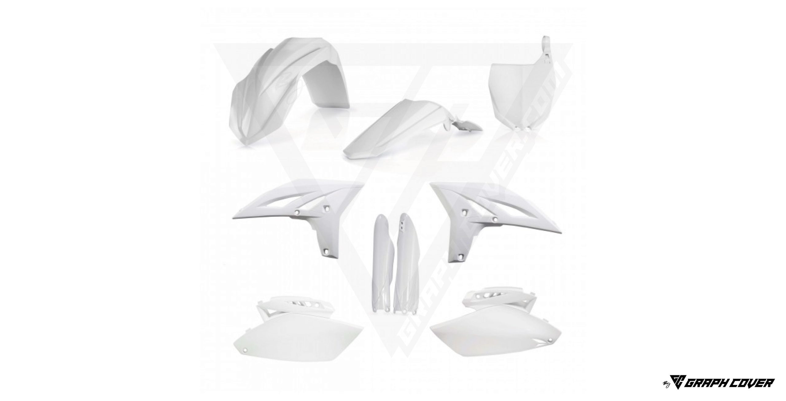 Plaque avant, Plaques latérales, Garde-boue avant, Garde-boue arrière, Ouies de radiateur, Protections de fourche.
