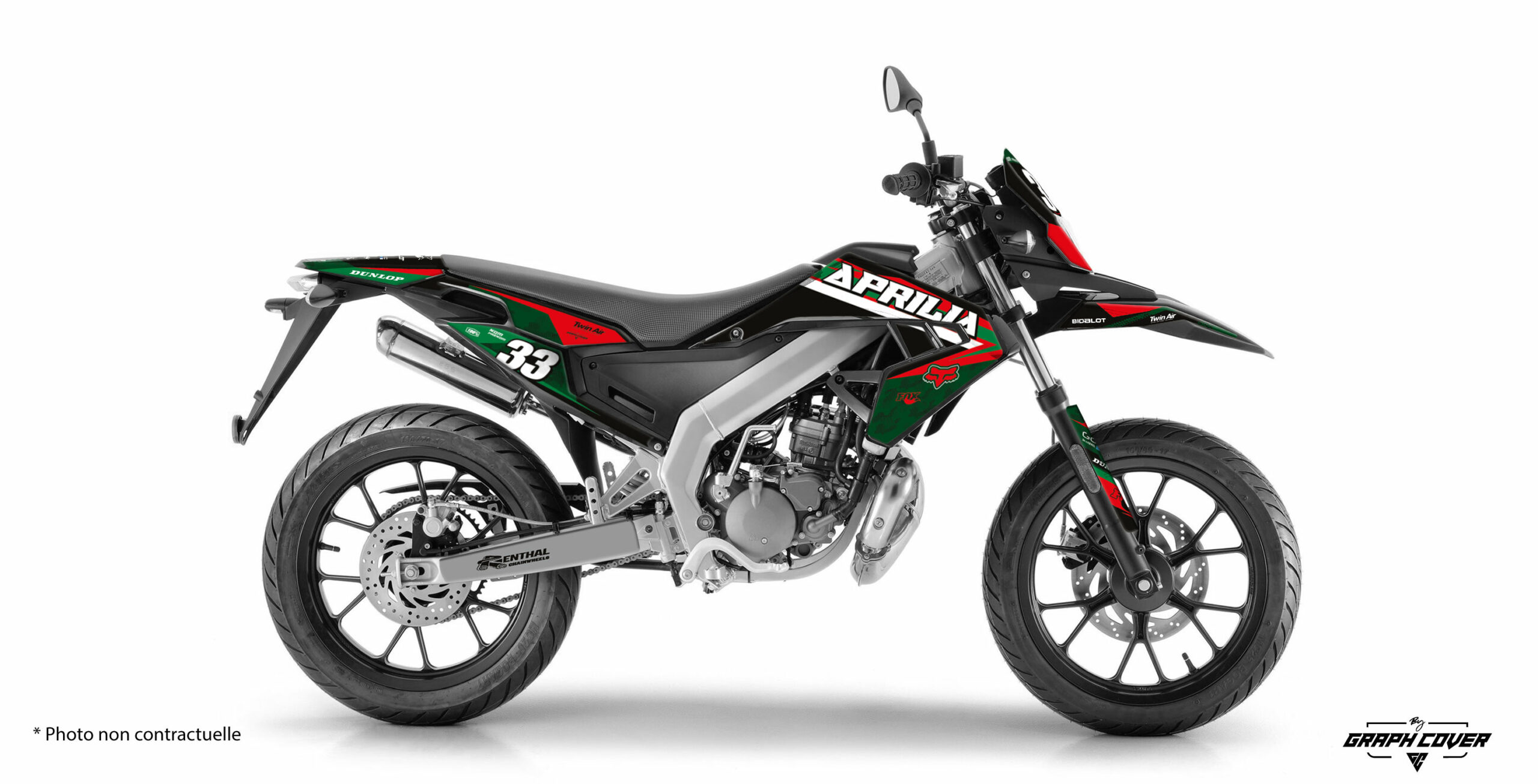 Nos kits déco semi-custom pour Aprilia motos 50cc sont la solution idéale pour donner un nouveau look esthétique à votre moto. Avec une large gamme de couleurs et d’options, vous pouvez créer un kit Aprilia motos 50cc parfaitement adapté à votre moto grâce à la possibilité d’intégrer des garde-boue ou des panneaux de phares non originaux. Pour vous offrir le meilleur, Graph Cover utilise une impression haute définition et une impression numérique en quadrichromie avec des couleurs vives de haute qualité qui ne s’estompent pas avec le temps grâce au revêtement résistant aux UV, notamment en tout-terrain.