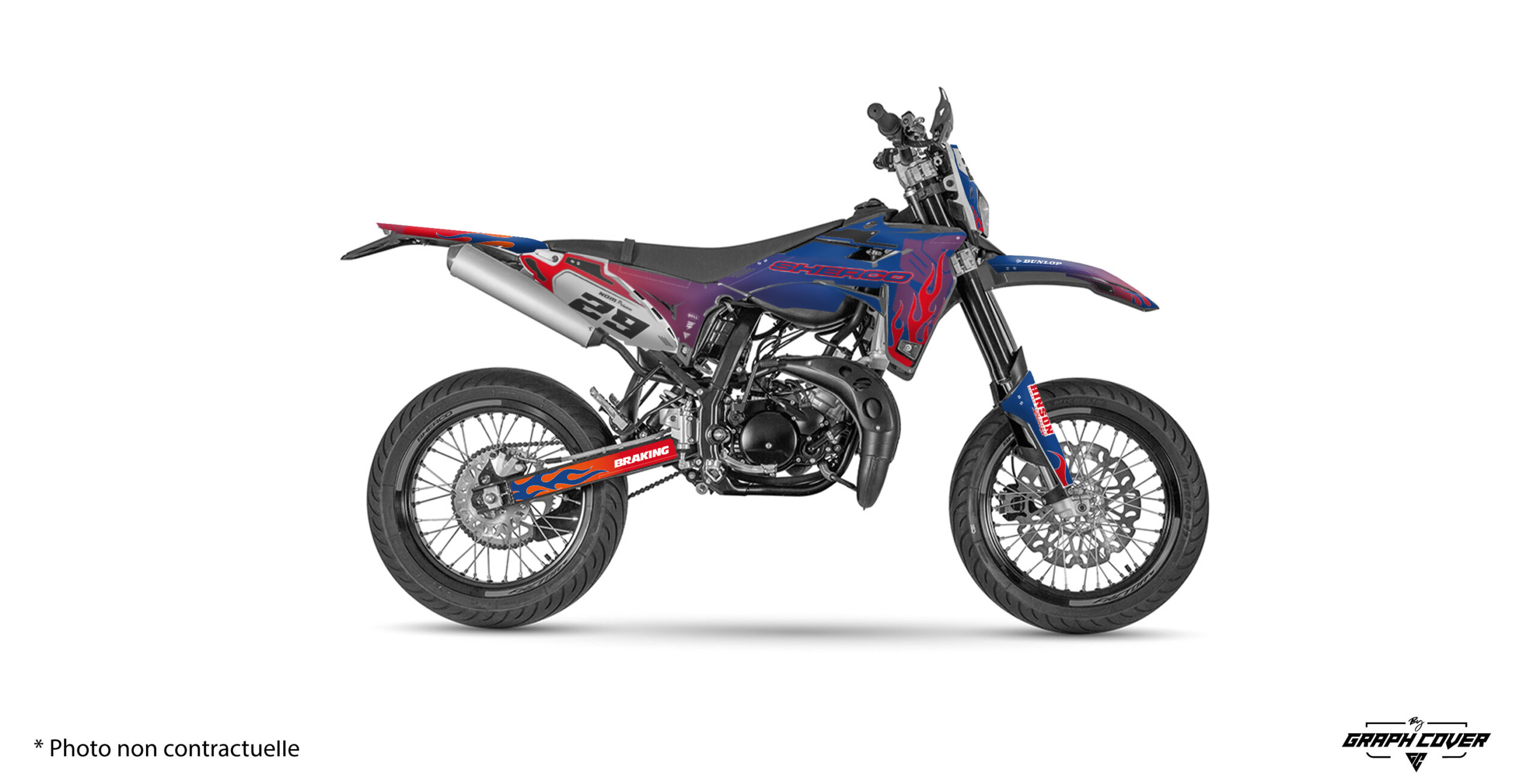 Transformez votre moto avec le Kit déco Sherco 50cc Axion. Pensé pour les passionnés de personnalisation, ce design coloré et énergique insuffle un esprit racing à votre 50cc. Le style « flamme » revisité donne du punch à votre moto, avec des déclinaisons en bleu-rouge, gris métallisé ou jaune intense. Grâce à ce kit, chaque détail compte pour affirmer votre style sur la route comme à l’arrêt.