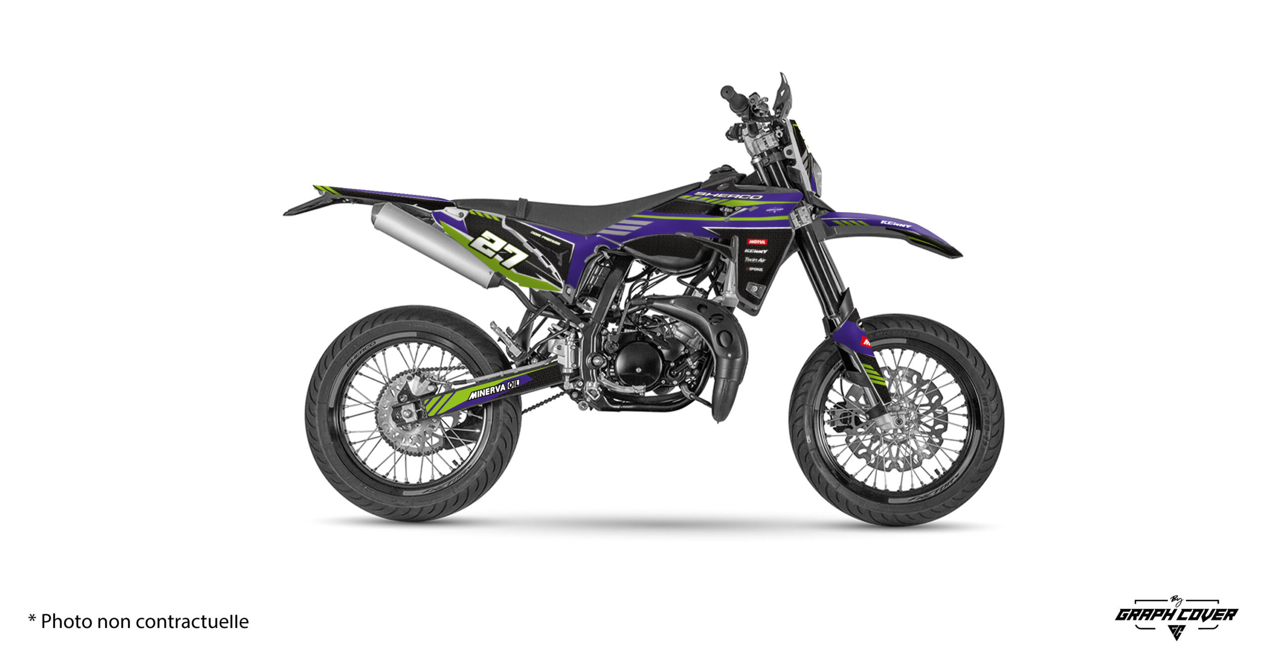 Le Kit déco Sherco SM50 est un excellent choix pour redonner vie à votre moto ou simplement affirmer votre style. Tous nos modèles sont réalisés à la commande pour éviter le gaspillage et permettre une personnalisation possible (ajout prénom, numéro, sponsors, etc.).
