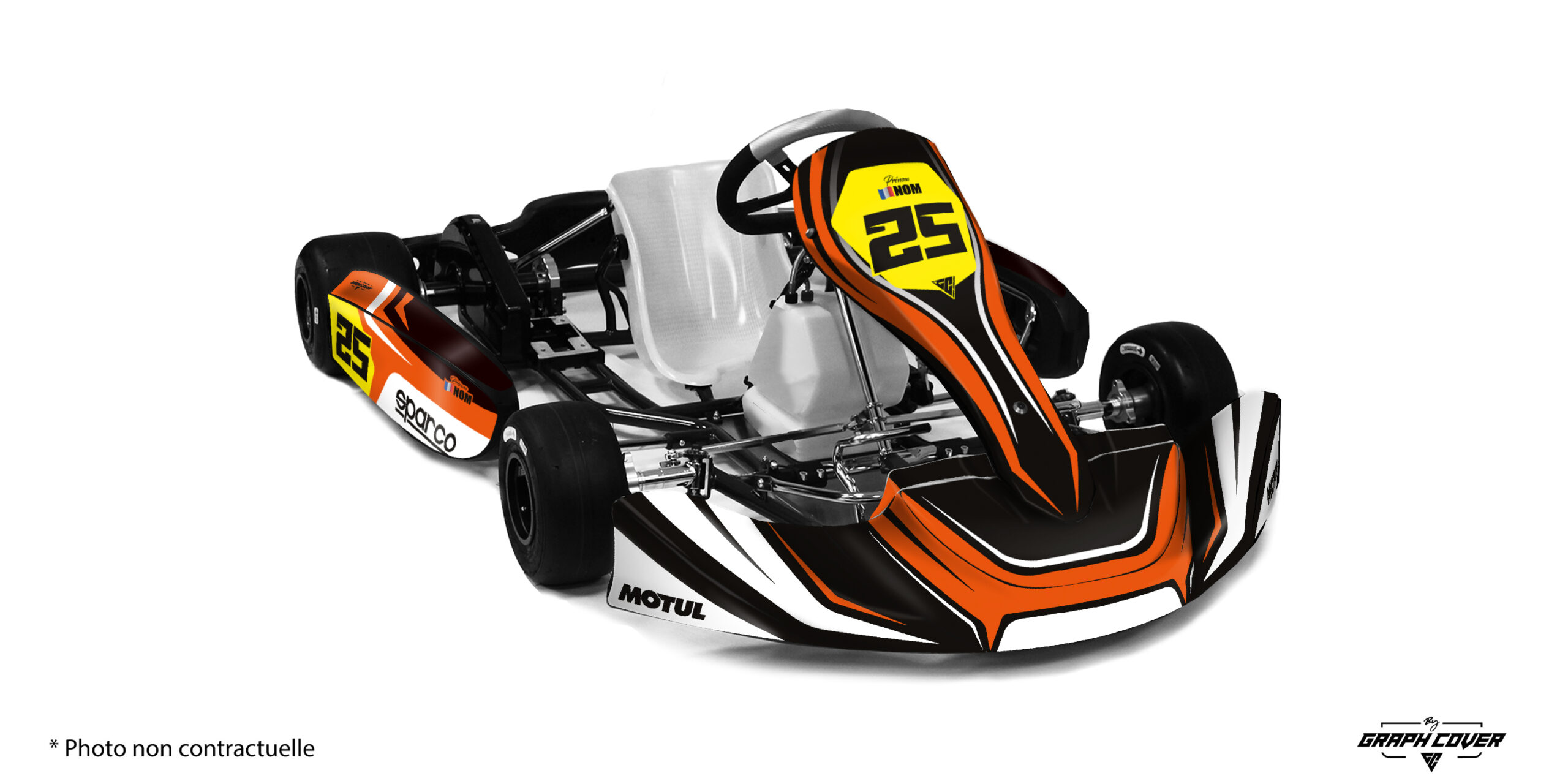 - Numéro et nom du pilote : chaque kit inclut une zone personnalisable avec l’option « Noms et Numéros » pour afficher clairement votre numéro et votre nom, permettant une reconnaissance facile sur la piste.