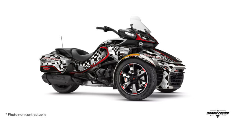 Le Kit déco Spyder F3 Limited Phantom s’inspire des codes visuels urbains et tactiques. Les formes dynamiques créent un jeu d’ombres qui souligne naturellement les volumes du véhicule. Ce contraste apporte un effet de mouvement même à l’arrêt. Grâce à ce traitement graphique, la machine gagne en caractère et s’affirme immédiatement sur la route.