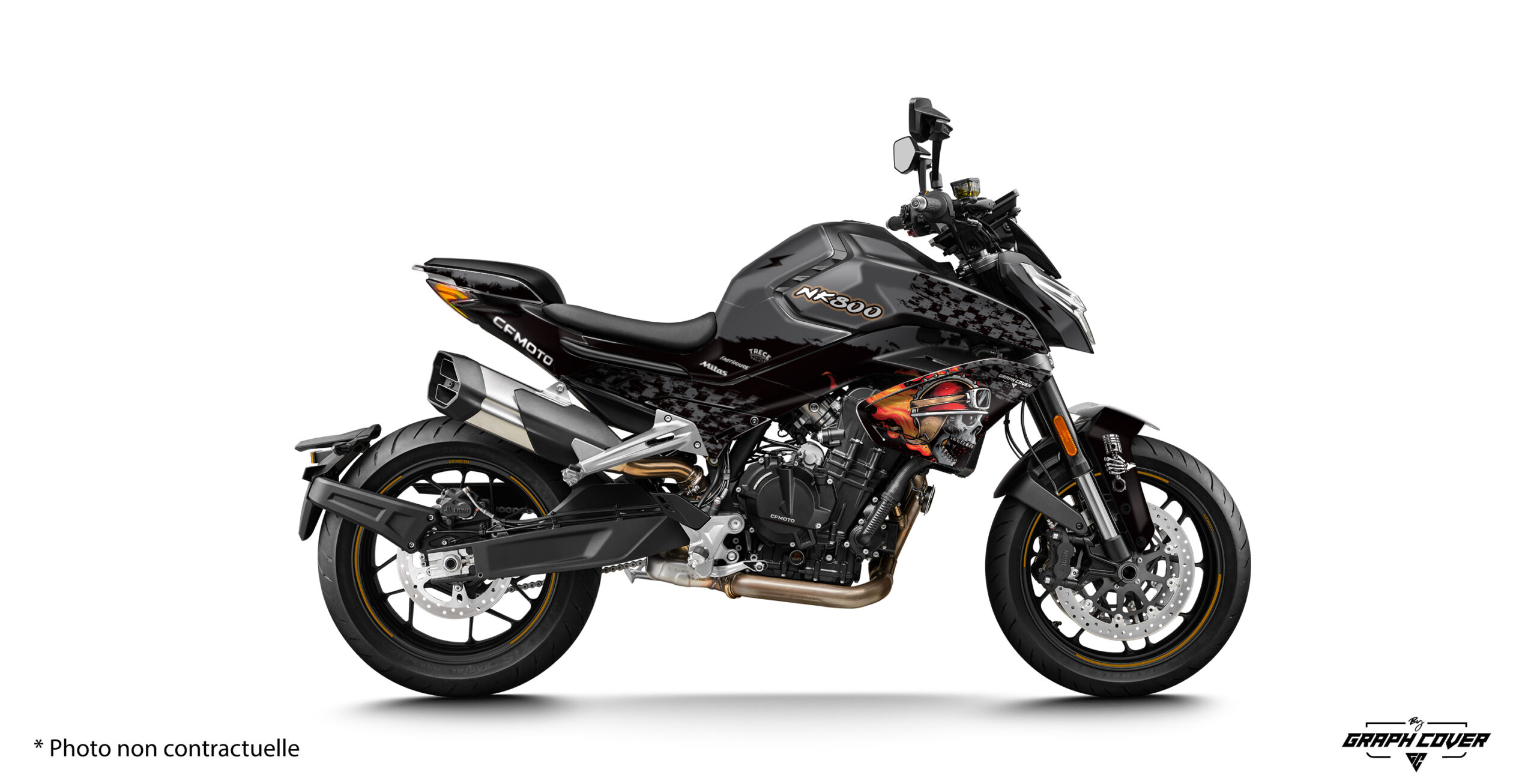 Chaque design intègre des détails percutants comme le crâne enflammé, des motifs damier inspirés des courses et des touches graphiques uniques qui renforcent l’identité de votre CF Moto 800NK.