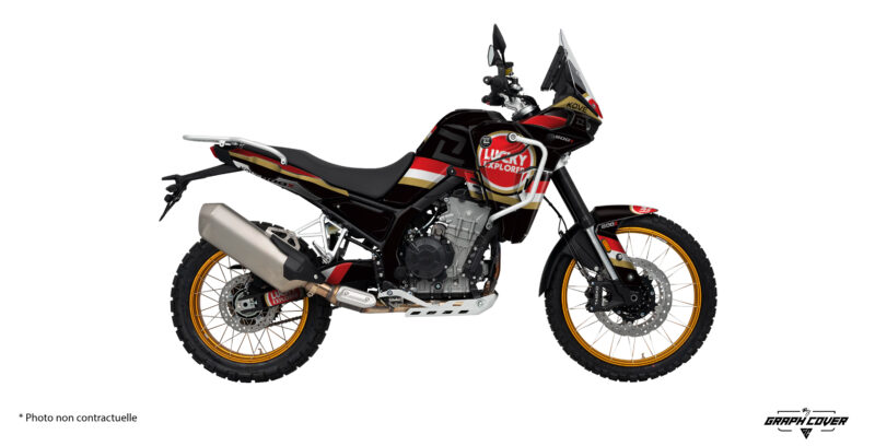 Le logo central « Lucky Explorer » capte immédiatement l’attention. Il évoque les grandes aventures et les motos d’expédition. Par ailleurs, les marquages Kove et 800x sont intégrés avec précision afin de conserver une lecture claire et moderne.