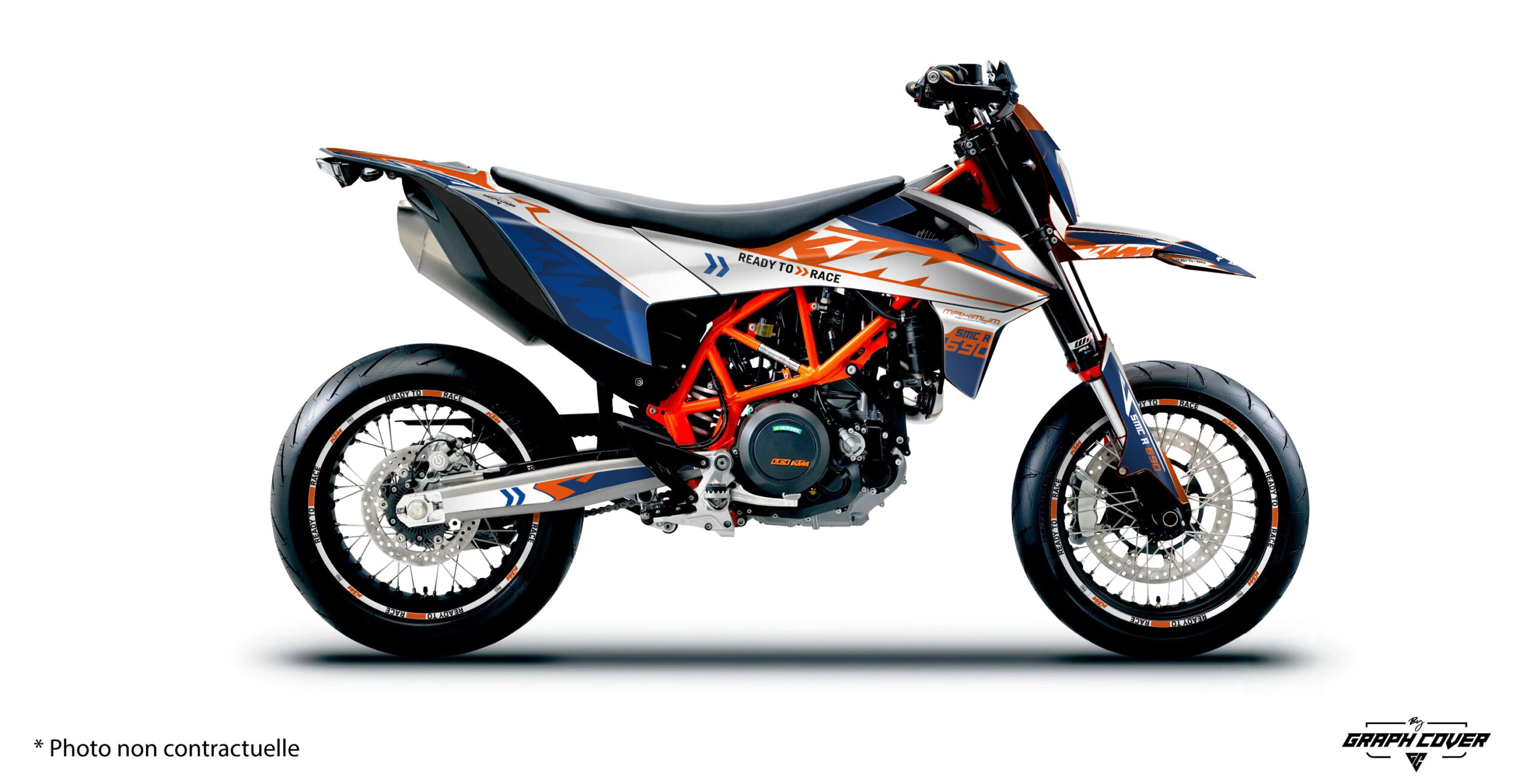 Par défaut, chaque Kit déco KTM SMC690 R est imprimé sur un vinyle blanc avec une finition brillante. Ainsi, les couleurs restent éclatantes et les détails précis.