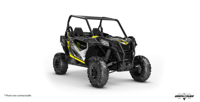 Ce kit full enveloppe les carénages et suit les volumes pour créer un ensemble compact. Il renforce les courbes du châssis, ce qui donne au véhicule une allure plus large. De plus, l’effet graphique simule des zones métal brossé, ce qui rend le SSV plus agressif sans paraître surchargé.
