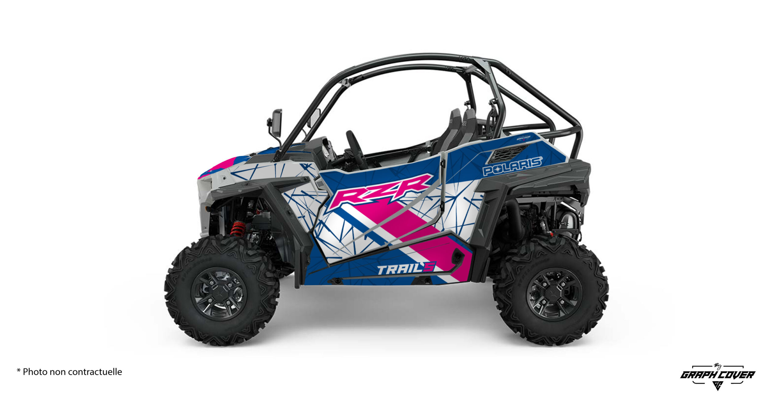- Bleu/Rose : La combinaison bleu et rose apporte un style vibrant et dynamique au Polaris RZR Trail S. Les motifs géométriques éclatants et les lignes contrastées donnent une impression de vitesse et de mouvement, faisant ressortir le véhicule sur les terrains les plus extrêmes. Cette option est idéale pour ceux qui veulent un look unique et flashy qui attire tous les regards.