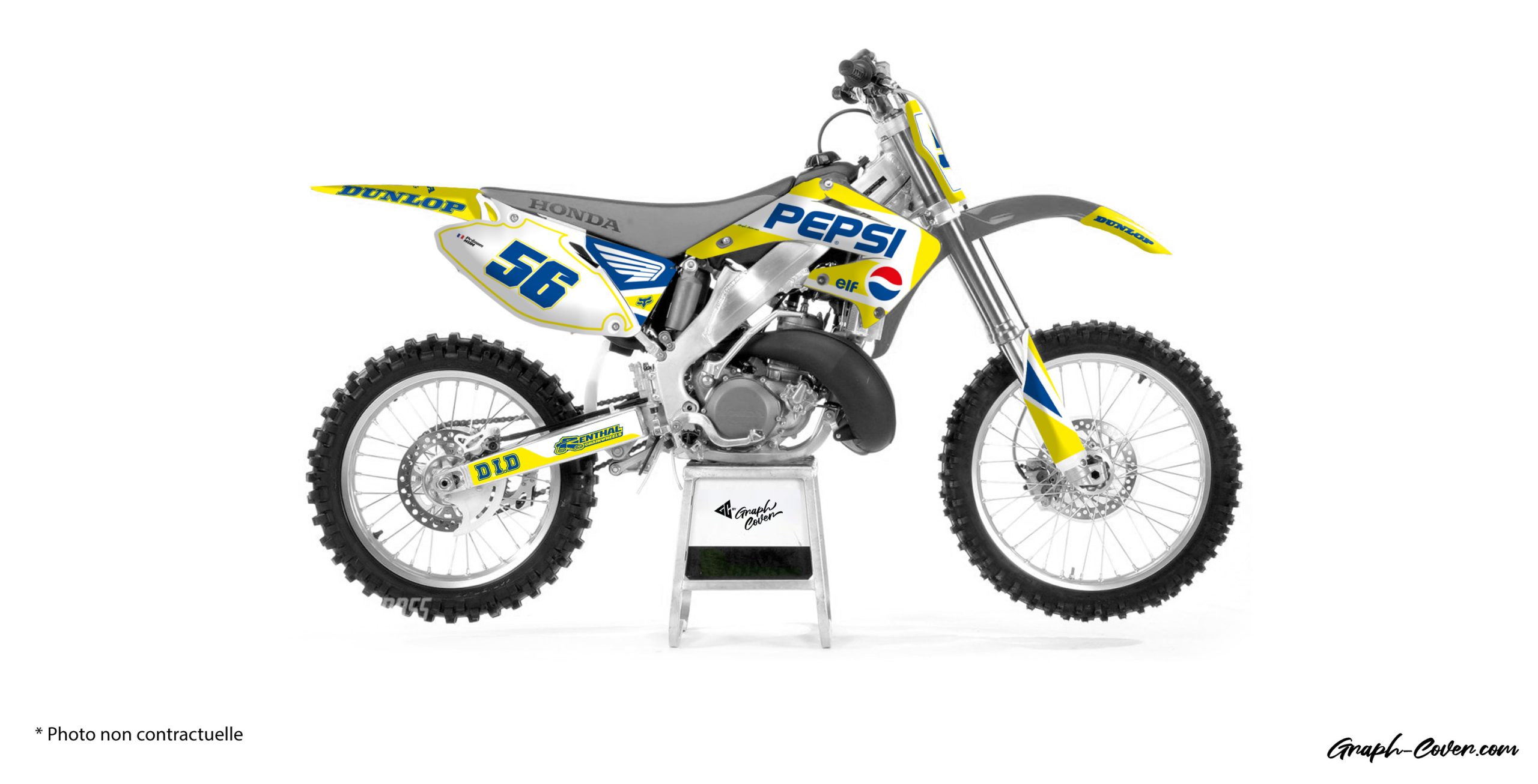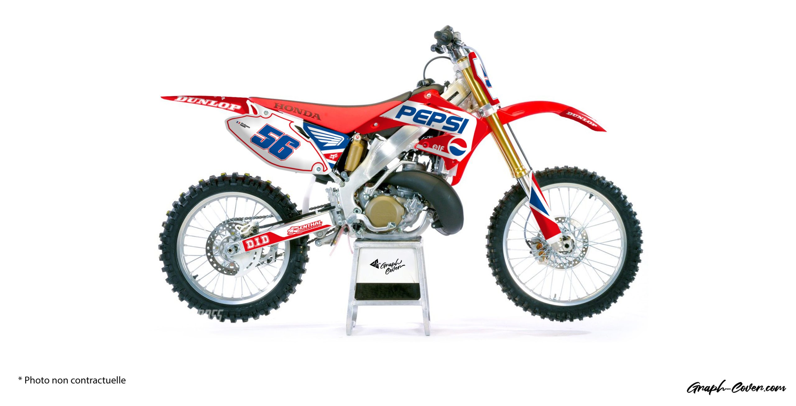 La série Honda CR est une gamme de motos de motocross, de trail et de sport à quatre temps fabriquées par la mythique marque japonaise Honda. Nos Kits déco personnalisés HONDA CR PEPS donneront un look sportif, aux couleurs de la célèbre boisson américaine, aux modèles compatibles.