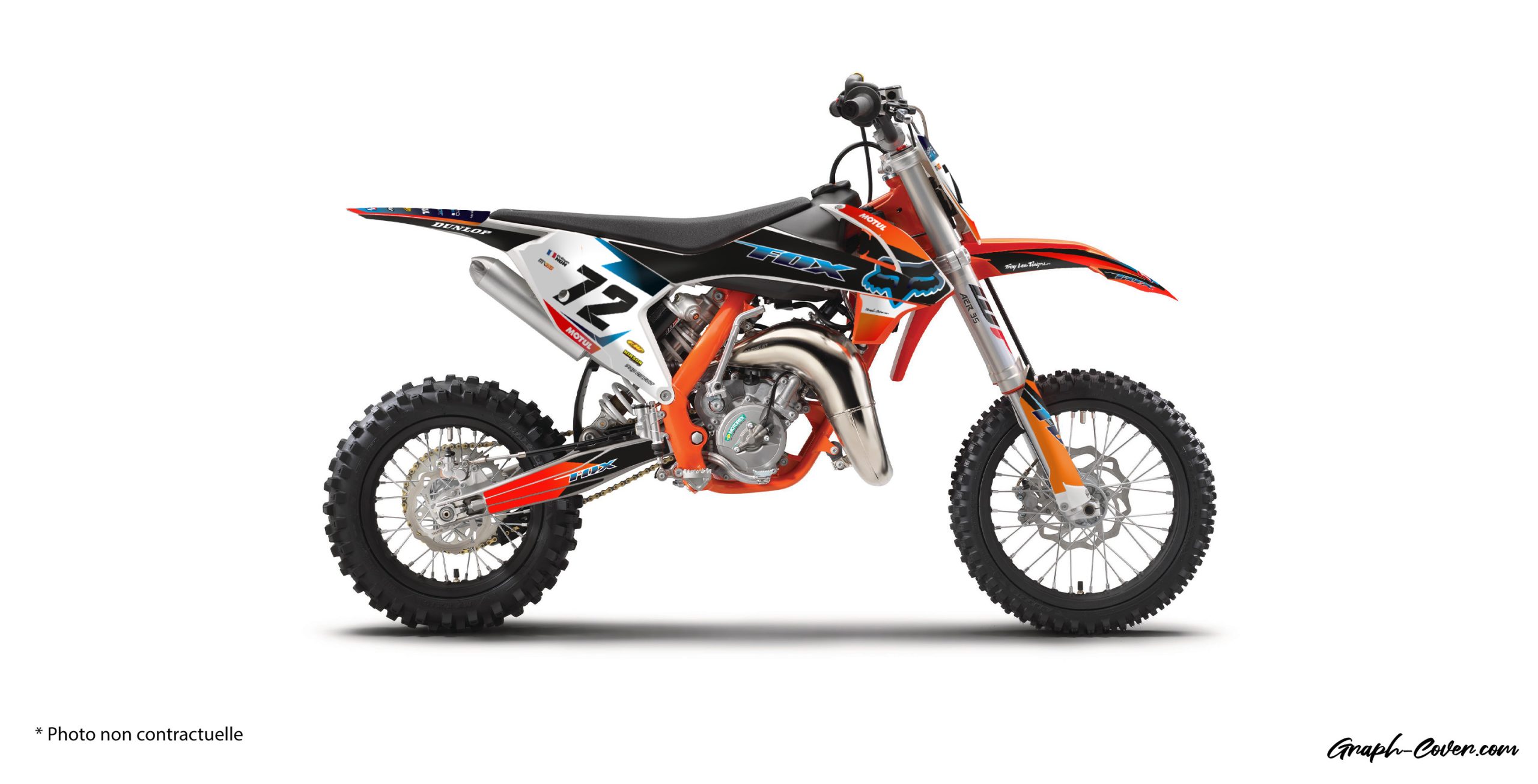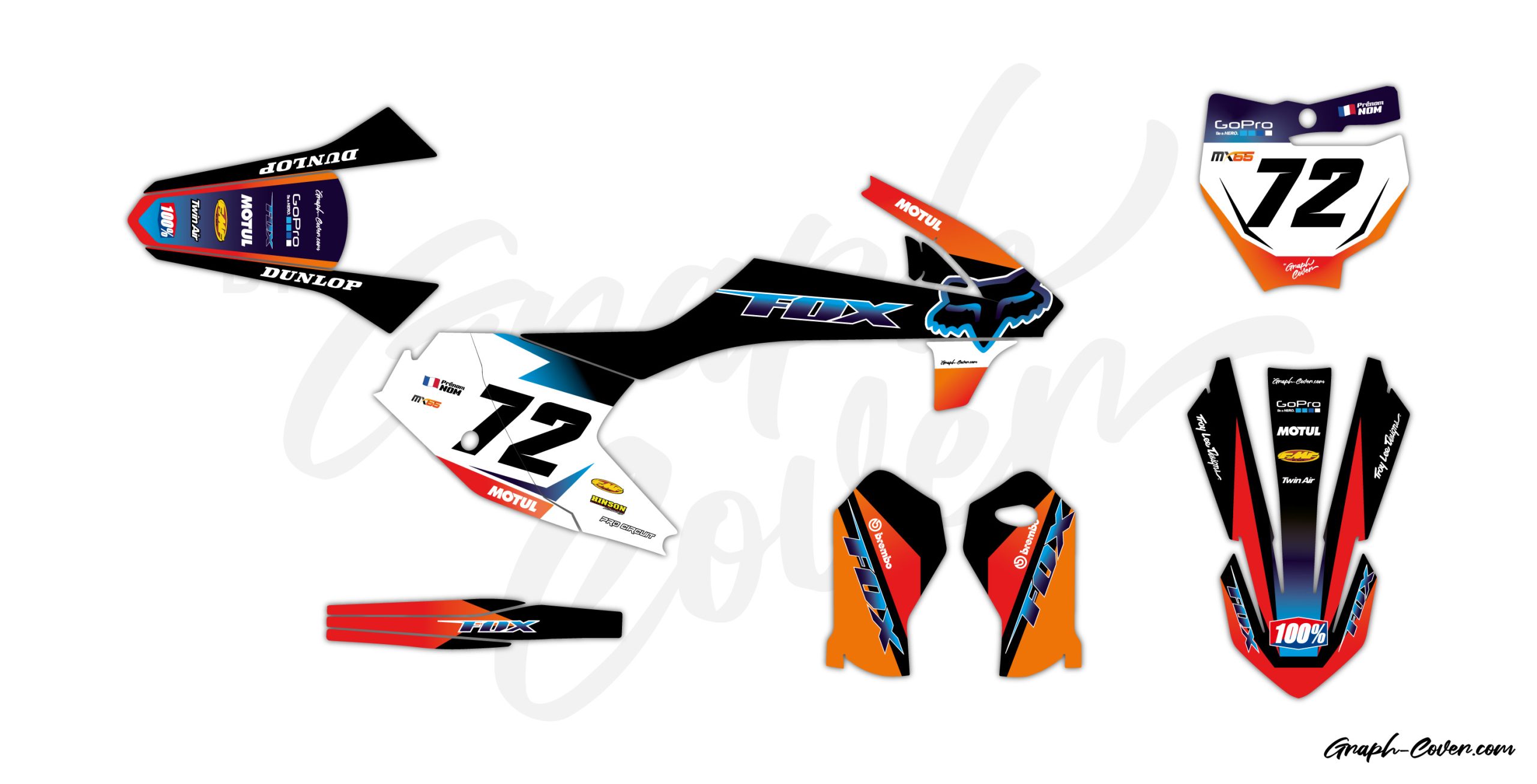 Composition du Kit déco Full : Plaque avant, Plaques latérales, Boîtes à air (pour certains modèles), Garde-boue avant, Garde-boue arrière, Ouies de radiateur, Protections de fourche (pour certains modèles), Bras oscillants (pour certains modèles).