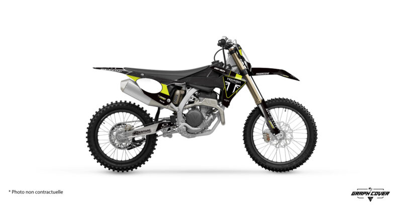 Le design Jude joue sur des contrastes dynamiques et des détails précis qui subliment les lignes de la Triumph TF-X. Disponible en plusieurs coloris, il permet de personnaliser votre machine en fonction de vos goûts, tout en mettant en valeur son caractère agressif et sportif. Avec ce Kit déco Triumph TF 450 X, vous apportez à votre moto une signature unique et reconnaissable.