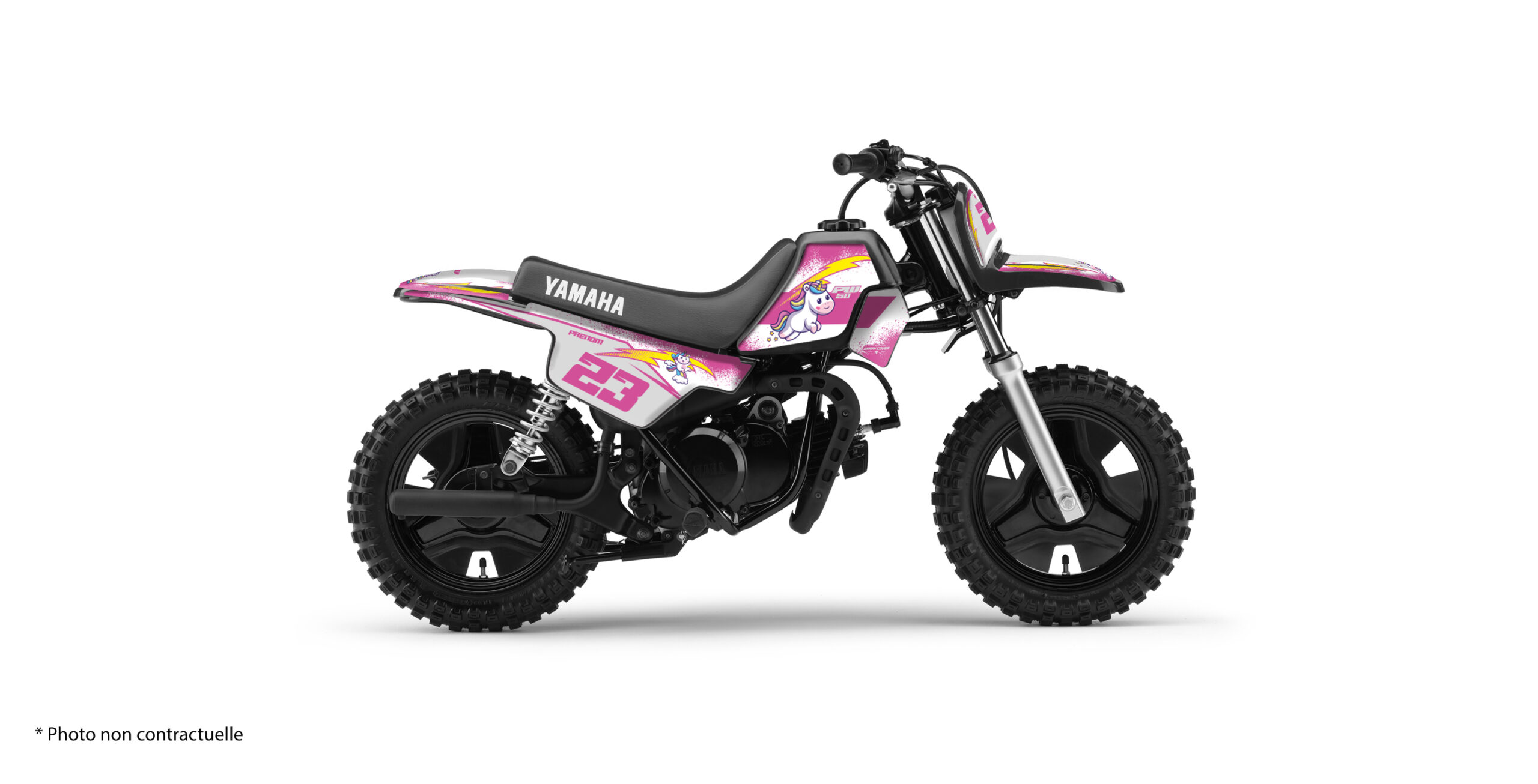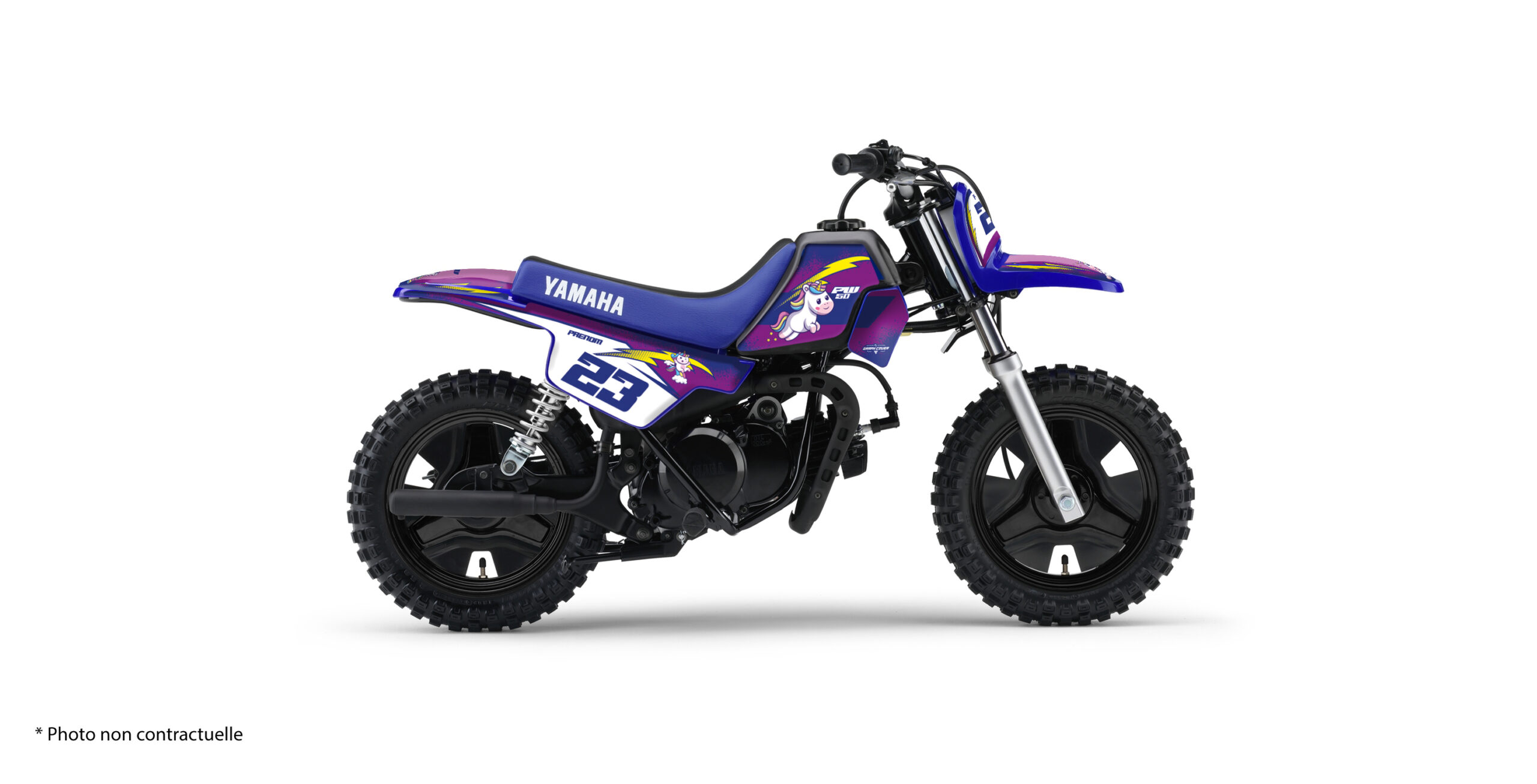 Le résultat est parfait pour une petite pilote. Ou pour un enfant qui veut une moto originale. Le kit apporte une vraie personnalité à la Yamaha PW 50. Et il reste très propre visuellement. L’ensemble est équilibré. Les lignes restent racing. Et les licornes ajoutent une touche fun assumée.