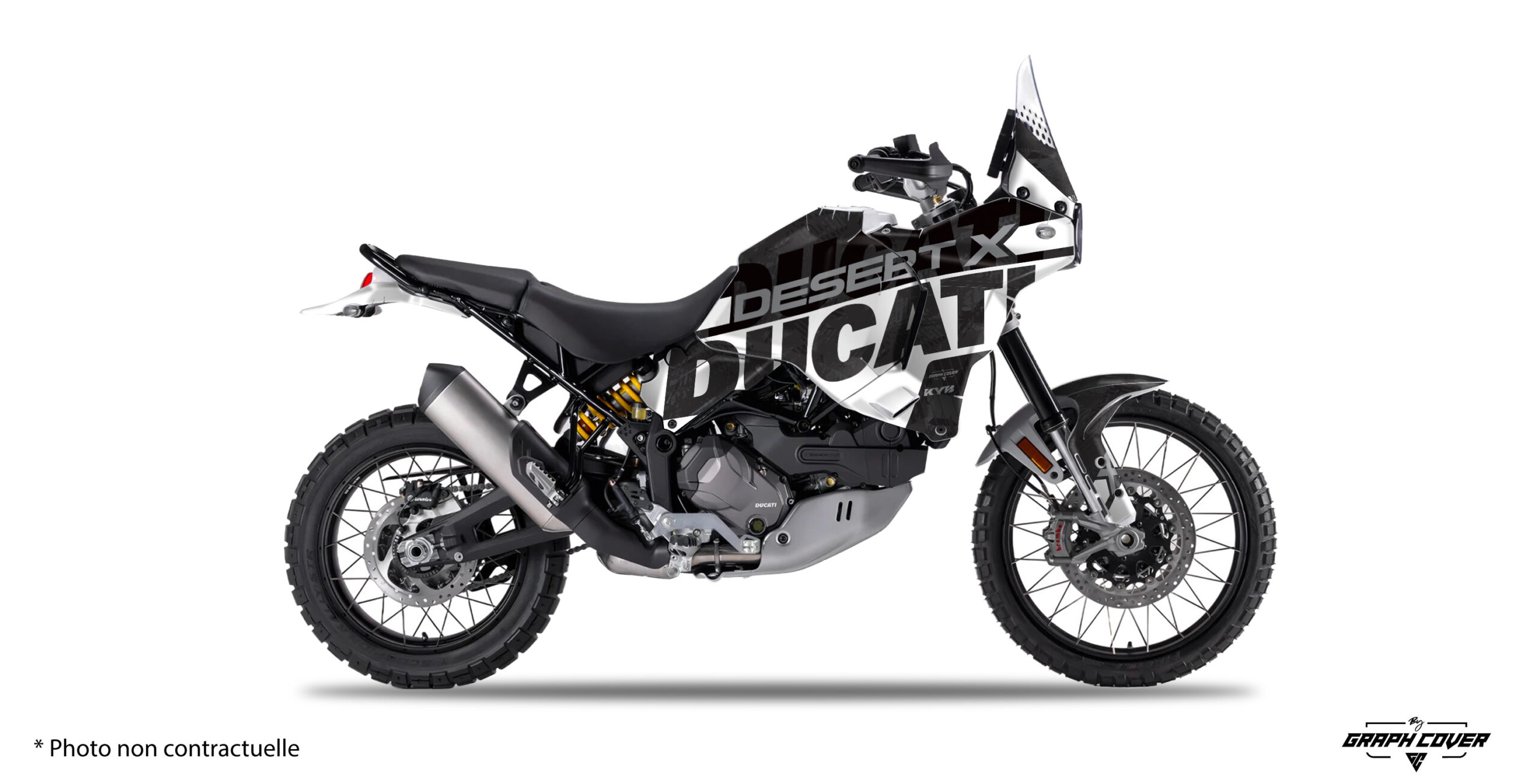 Le kit Ducati Desert X Jakarta allie élégance et modernité avec un design sobre mais sophistiqué. Ce kit se distingue par ses lignes épurées qui mettent en valeur la silhouette racée de la moto, tout en intégrant des motifs subtils style carbone forgé. Ces motifs, appliqués principalement sur les zones clés, évoquent à la fois robustesse et légèreté, rappelant les matériaux de pointe utilisés dans les motos de compétition. Disponible en trois variantes de couleurs – blanc, rouge et noir – ce kit permet une personnalisation raffinée. Le blanc offre une allure pure et lumineuse, tandis que le rouge, emblématique de Ducati, accentue l’esprit sportif et passionné de la marque. Le noir, quant à lui, apporte une dimension plus discrète et élégante, parfaite pour les pilotes recherchant une esthétique plus sobre. Les logos Ducati sont discrètement intégrés au design, placés de manière harmonieuse sur les flancs et le réservoir, offrant une visibilité subtile mais marquée. Facile à installer et résistant aux conditions extrêmes, ce kit est idéal pour les amateurs de Ducati qui cherchent à allier performance et raffinement sur leur Desert X.