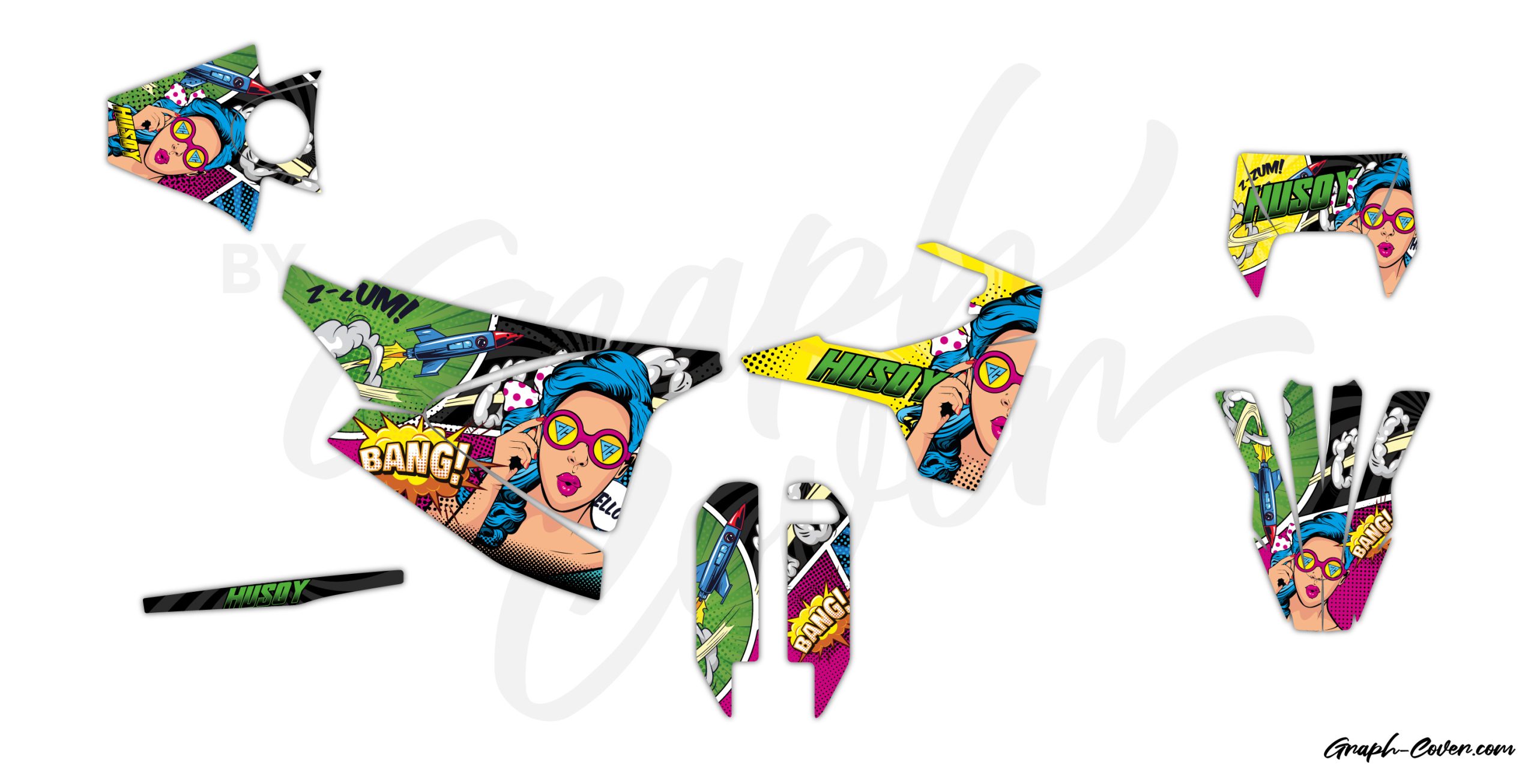 Composition du Kit déco Full : Plaque avant, Plaques latérales, Boîtes à air, Garde-boue avant, Garde-boue arrière, Ouies de radiateur, Protections de fourche, Bras oscillants.
