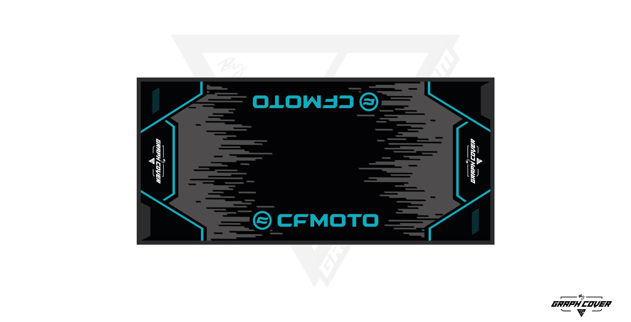 Le tapis sol moto CFMOTO se distingue par son graphisme racé en noir profond et bleu turquoise, couleur emblématique de la marque.