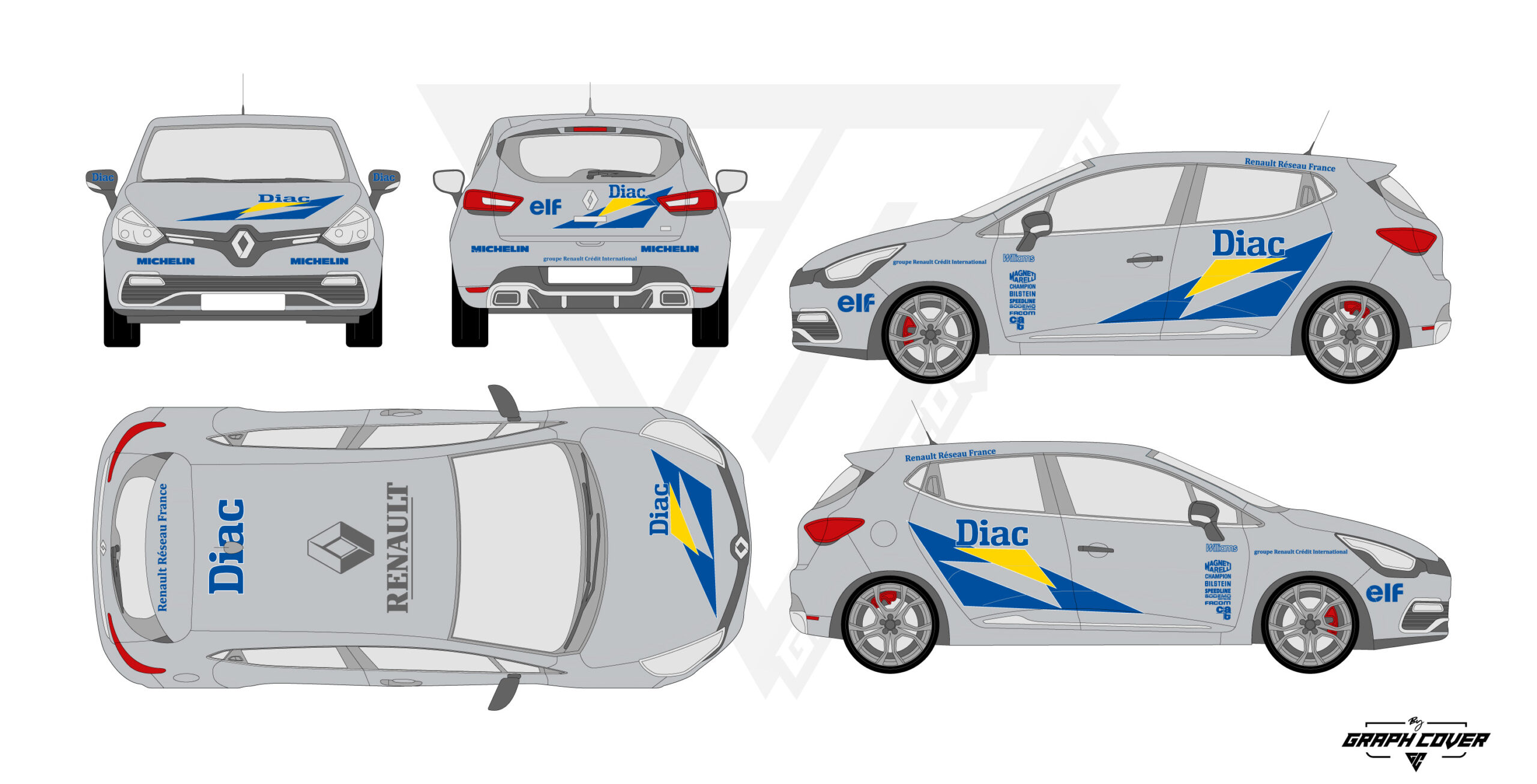 Le Kit stickers Clio Rally Diac s’inspire directement des livrées officielles de rallye engagées en compétition.